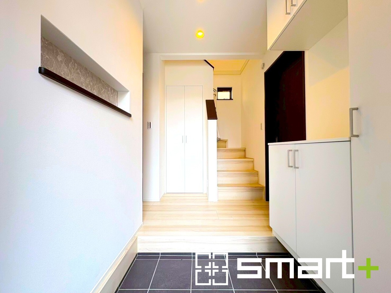 B号棟 ~玄関はオシャレな空間~ ・スタイリッシュで洗練された印象の玄関。ホワイトカラー仕様で圧迫感もなくオシャレな空間を演出してくれます。 ・コの字型のシューズボックスは大容量の収納力でお気に入りの靴もたっぷりしまえますね。