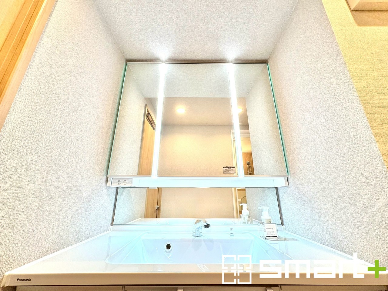 ~人気の三面鏡を採用~ ・洗面台は三面鏡仕様なので鏡の角度を変える事で頭の後ろの方までご確認可能です。 ・鏡の裏が収納になっておりますので、洗面台周りもスッキリと片付きます。