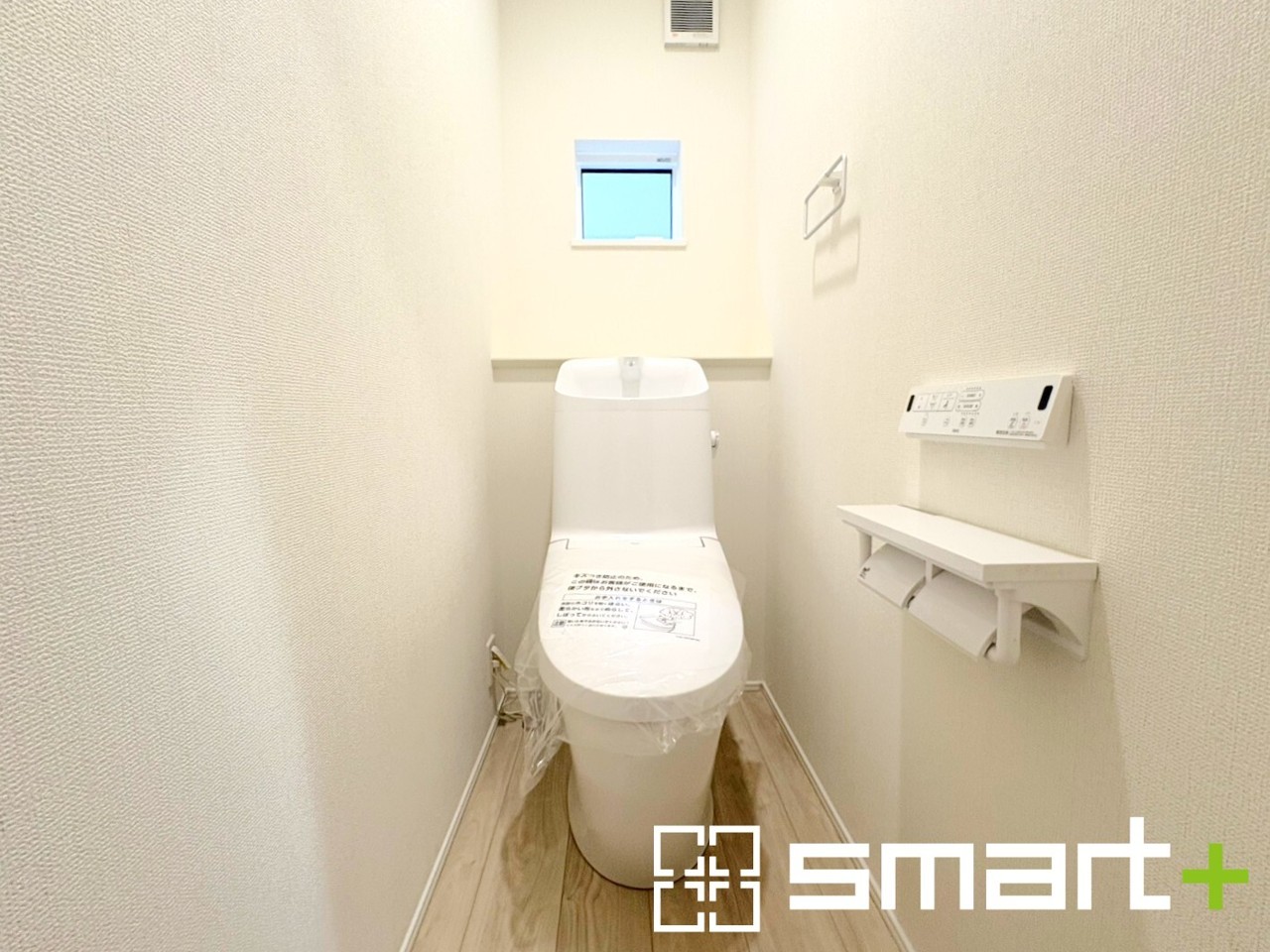 2号棟 ~小窓付きの明るいトイレ~ ・使用後や掃除の際には新鮮な空気を取り込み換気ができます。 ・背面のスペースにちょっとした棚を設置すれば、トイレットペーパーのストックなども置けますね。