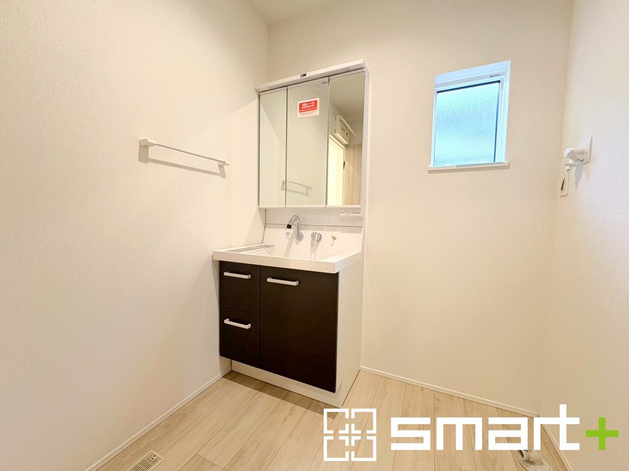 2号棟 ~明るい洗面スペース~ ・窓から明るい陽が入り、気持ちよく朝の支度ができますね。 ・使い勝手の良い三面鏡タイプのシャワー付き洗面化粧台。鏡の裏に収納があるので洗面台周りもスッキリ。