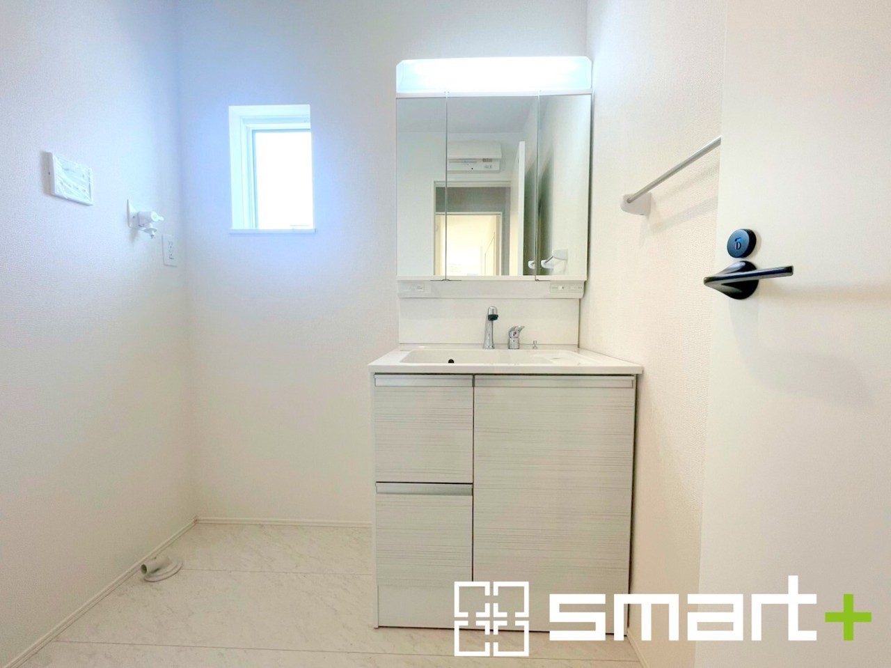 ~明るい洗面スペース~ ・窓から明るい陽が入るので、気持ちよく朝の支度ができますね。 ・使い勝手の良い三面鏡タイプのシャワー付き洗面化粧台。鏡の裏に収納があるので洗面台周りもスッキリ。