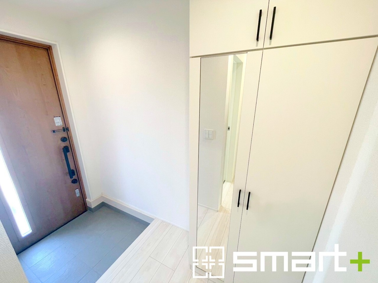 ~穏やかな陽が入る玄関~ ・玄関ドアにガラス部分を設ける事で穏やかな陽の入る玄関になります。 ・備え付けのシューズボックスはミラー付なのでお出かけ前の身支度チェックに大活躍。