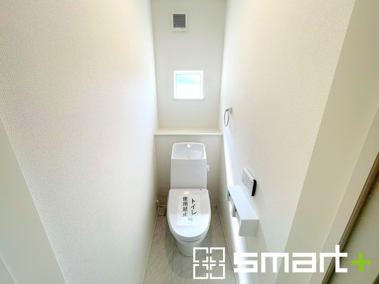 ~窓付きの明るいトイレ~ ・清潔感あるシャワートイレ。窓があるので換気もしやすく快適ですね。 ・背面にある棚はトイレットペーパーなどの置き場や飾り棚としても利用できますね。