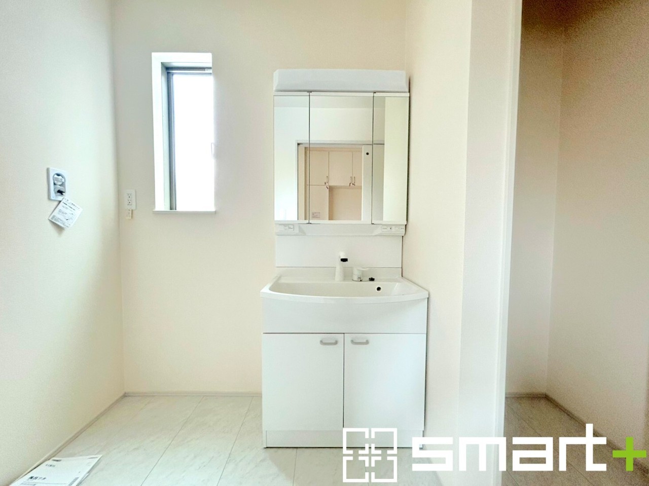 ~明るい洗面スペース~ ・窓から明るい陽が入るので、気持ちよく朝の支度ができますね。 ・使い勝手の良い三面鏡タイプのシャワー付き洗面化粧台。鏡の裏に収納があるので洗面台周りもスッキリ。