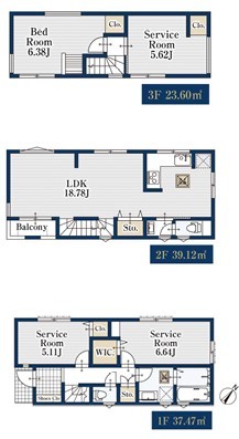 | 間取 | 1SLDK + 3S、WIC (LDK18.78帖、洋室6.38帖、S6.64帖、S5.62帖、S5.11帖) | ||