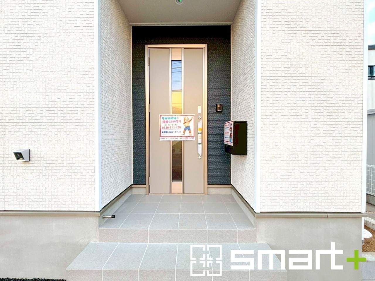 2号棟 ~お住まいの顔「玄関」~ ・玄関ドアの上にはもちろん軒がございますので、雨の日でも濡れずに鍵の開閉が可能です。 ・鍵は防犯性に優れたディンプルキーを採用。