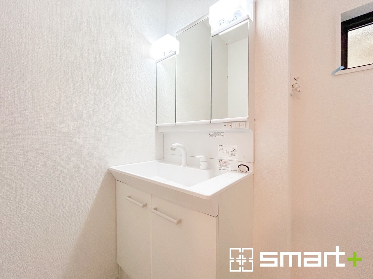 ~人気の三面鏡を採用~ ・洗面台は三面鏡仕様なので鏡の角度を変える事で頭の後ろの方までご確認可能です。 ・鏡の裏が収納になっておりますので、洗面台周りもスッキリと片付きます。