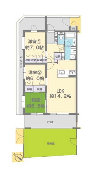 | 間取 | 3LDK (LDK14.2帖、和室5.5帖、洋室7帖、洋室6帖) | ||