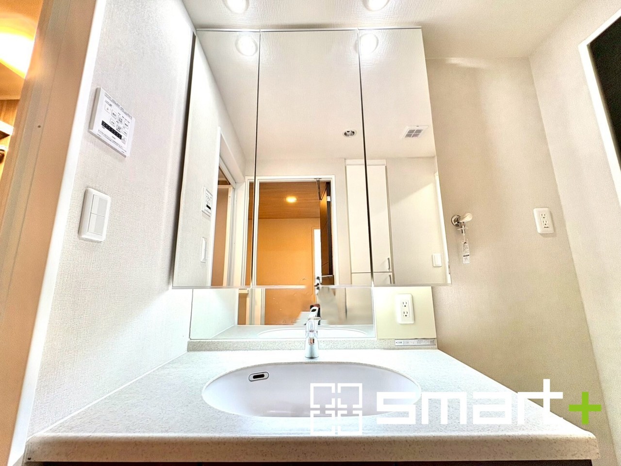 ~人気の三面鏡を採用~ ・洗面台は三面鏡仕様なので鏡の角度を変える事で頭の後ろの方までご確認可能です。 ・鏡の裏が収納になっておりますので、洗面台周りもスッキリと片付きます。