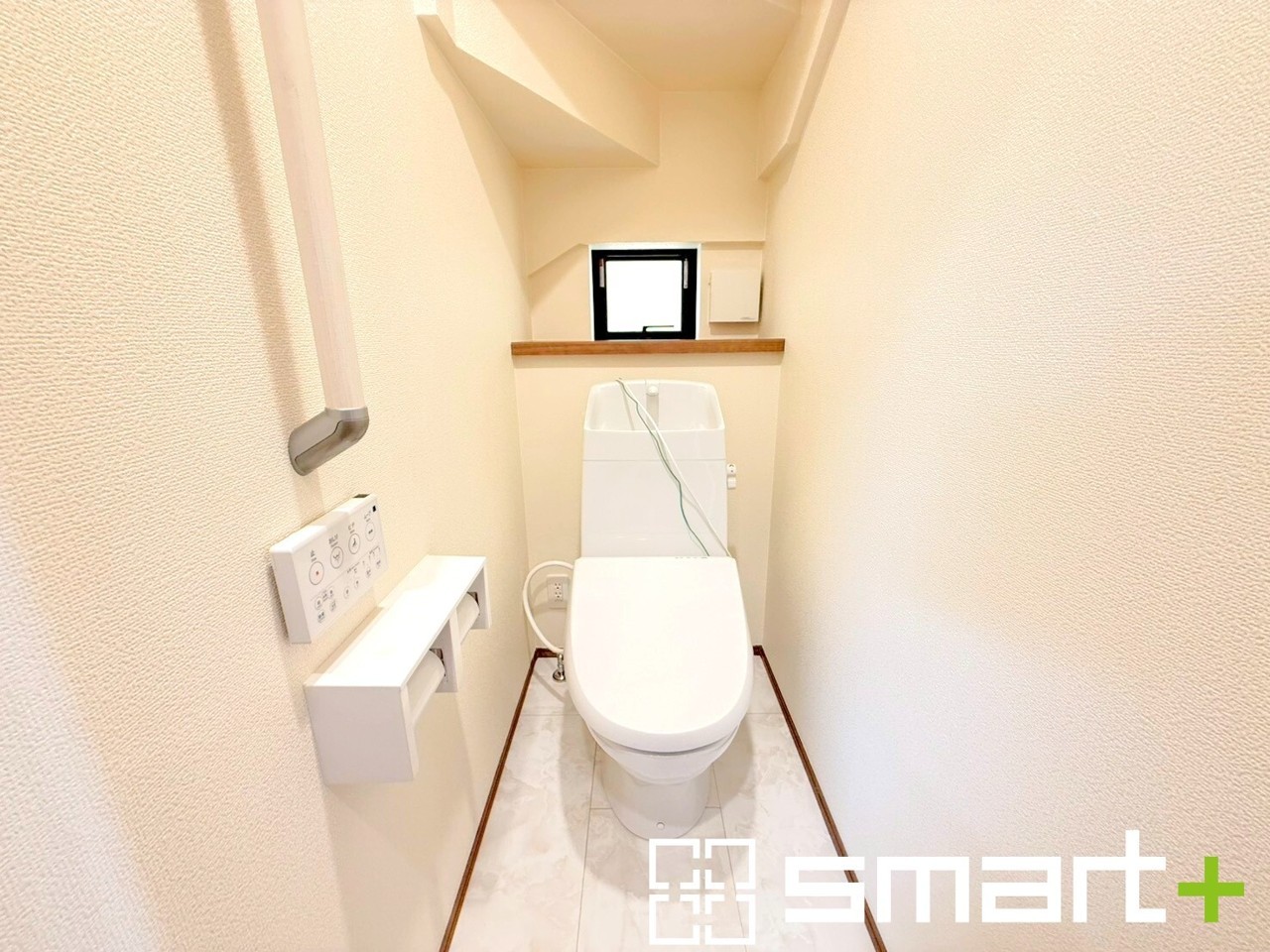 ~小窓付きの明るいトイレ~ ・使用後や掃除の際には新鮮な空気を取り込み換気ができます。 ・背面のスペースにちょっとした棚を設置すれば、トイレットペーパーのストックなども置けますね。