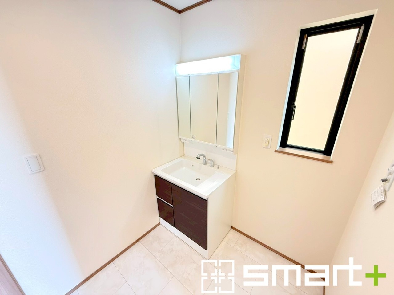 ~明るい洗面スペース~ ・窓から明るい陽が入るので、気持ちよく朝の支度ができますね。 ・使い勝手の良い三面鏡タイプのシャワー付き洗面化粧台。鏡の裏に収納があるので洗面台周りもスッキリ。