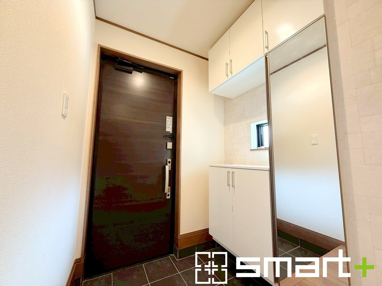 ~穏やかな陽が入る玄関~ ・飾り棚としても演出できるコの字型の下駄箱は大容量の収納力。 ・扉一面がミラーなので、スッキリ広々とした印象になりますね。おでかけ前の身支度チェックにも大活躍です。