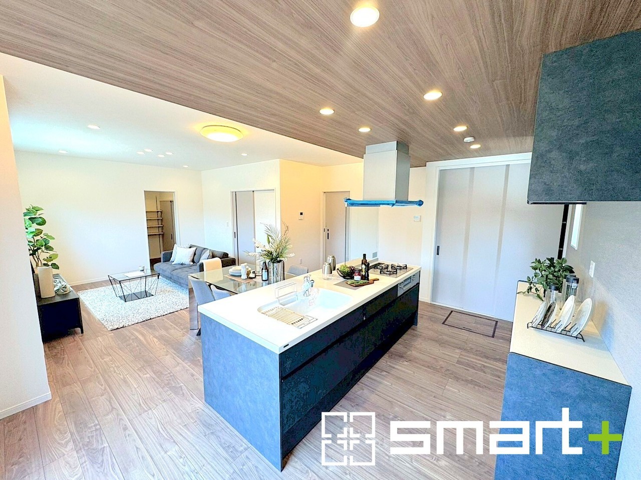 ~折下げ天井でオシャレな空間~ ・キッチン部分に折下げ天井を施すことでリビングが広く見える効果もあり、開放的な空間が広がります。 ・出来立てのお料理を運ぶのにも食器の後片付けも、ラクラクなカウンターキッチン。
