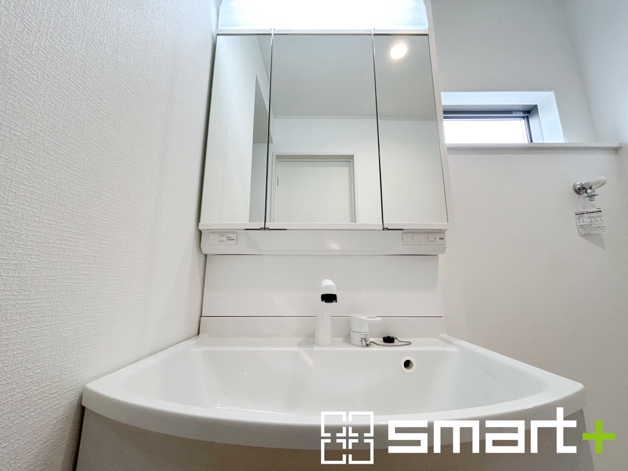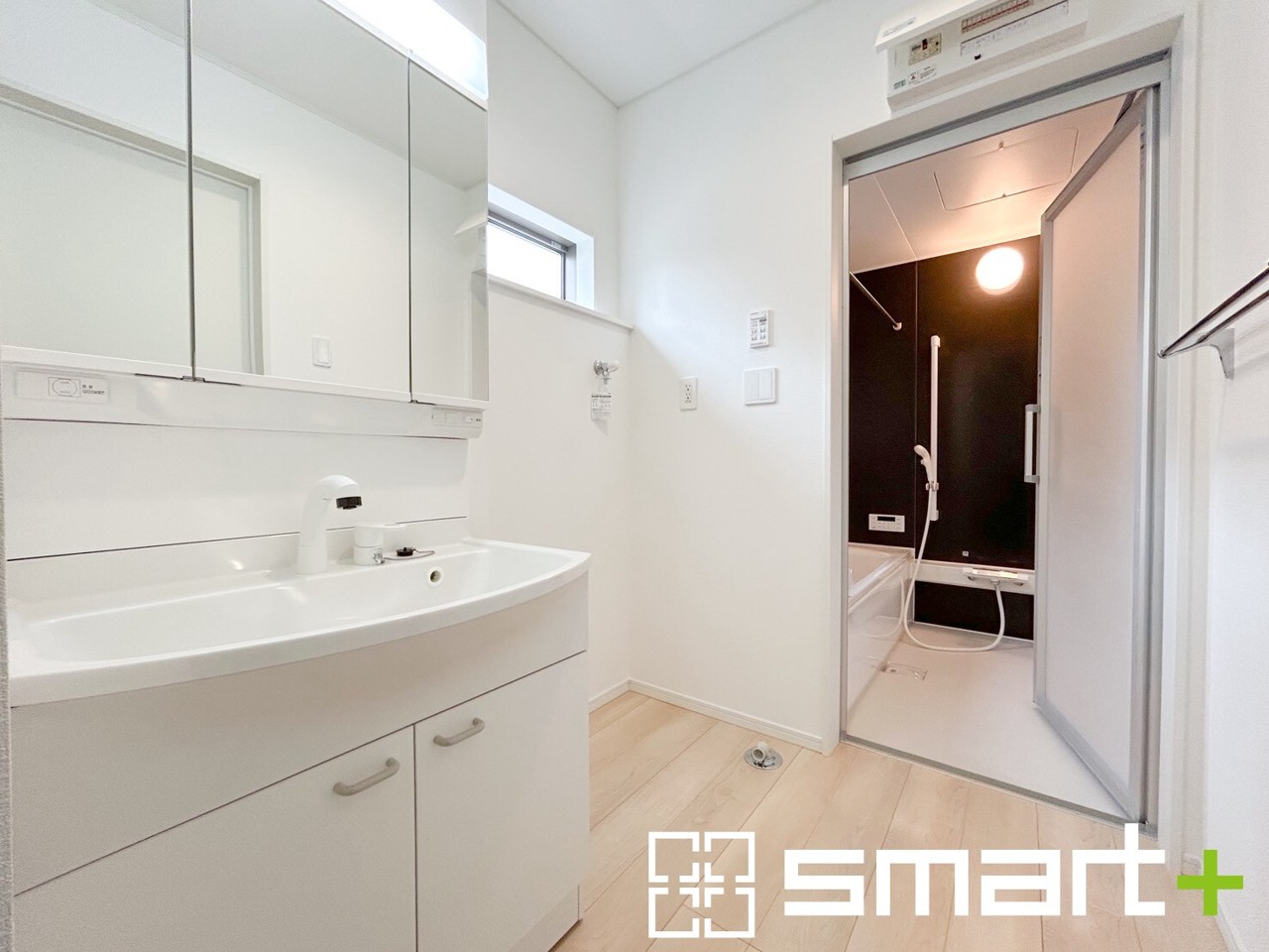 1号棟 ~人気の三面鏡を採用~ ・洗面台は三面鏡仕様なので鏡の角度を変える事で頭の後ろの方までご確認可能です。 ・鏡の裏が収納になっておりますので、洗面台周りもスッキリと片付きます。