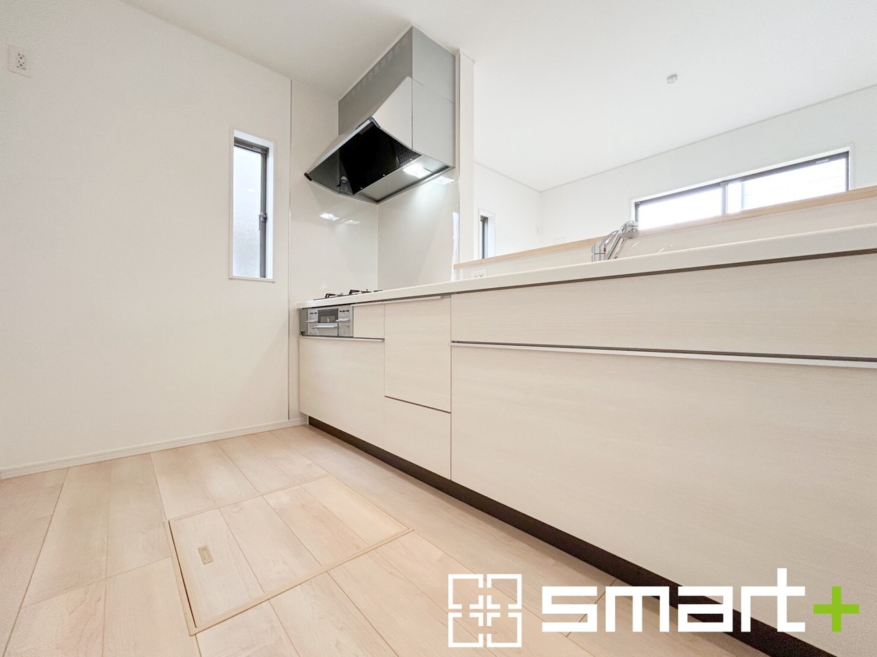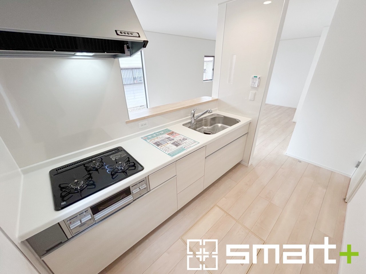 1号棟 ~使い勝手の良いシステムキッチン~ ・料理がしやすい設計のキッチンでお料理もはかどりますね。 ・もちろんキッチン下部は収納になっておりますので、フライパンなども収納可能です。