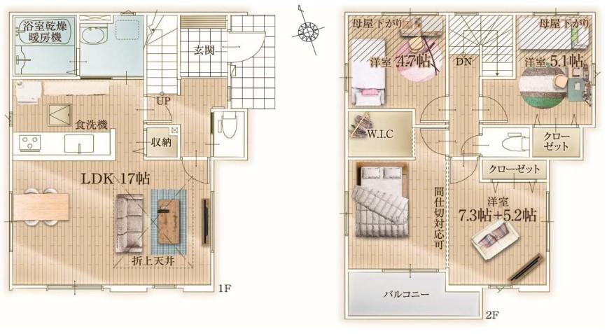 | 間取 | 3LDK + WIC、間仕切対応で4LDK可 (LDK17帖、洋室12.5帖、洋室5.1帖、洋室4.7帖) | ||