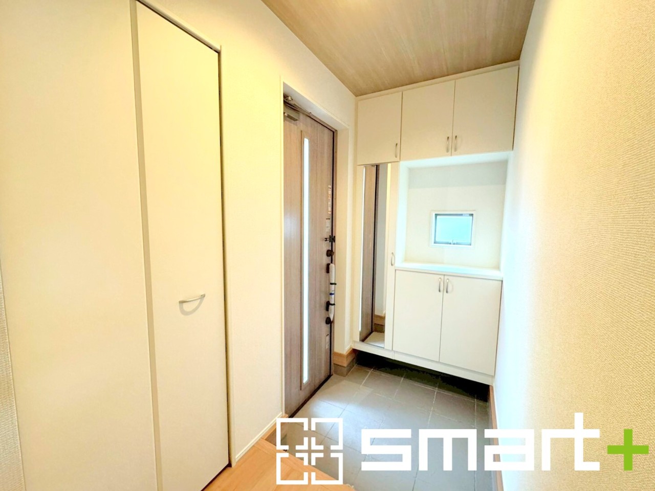 ~穏やかな陽が入る玄関~ ・窓に加えて玄関ドアのガラス部分からも穏やかな陽が入り、明るい玄関になります。 ・備え付けのシューズボックスはミラー付なのでお出かけ前のチェックに大活躍。