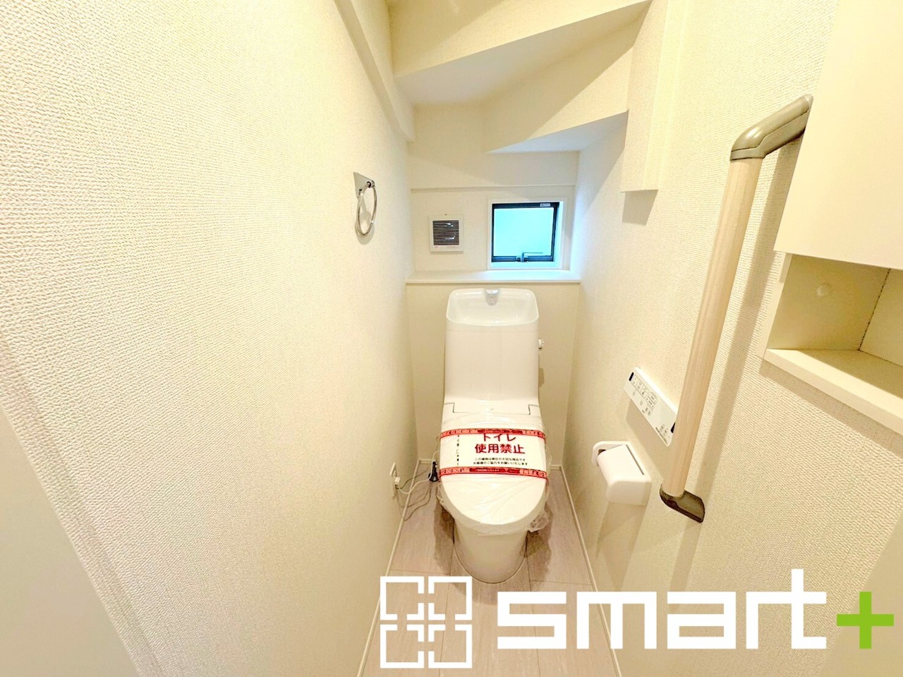 ~窓付きの明るいトイレ~ ・使用後や掃除の際に窓を開ければ、外からの新鮮な空気を取り込み素早く換気ができます。 ・埋め込み収納付きでストックや掃除用具もスッキリ片付きますね。