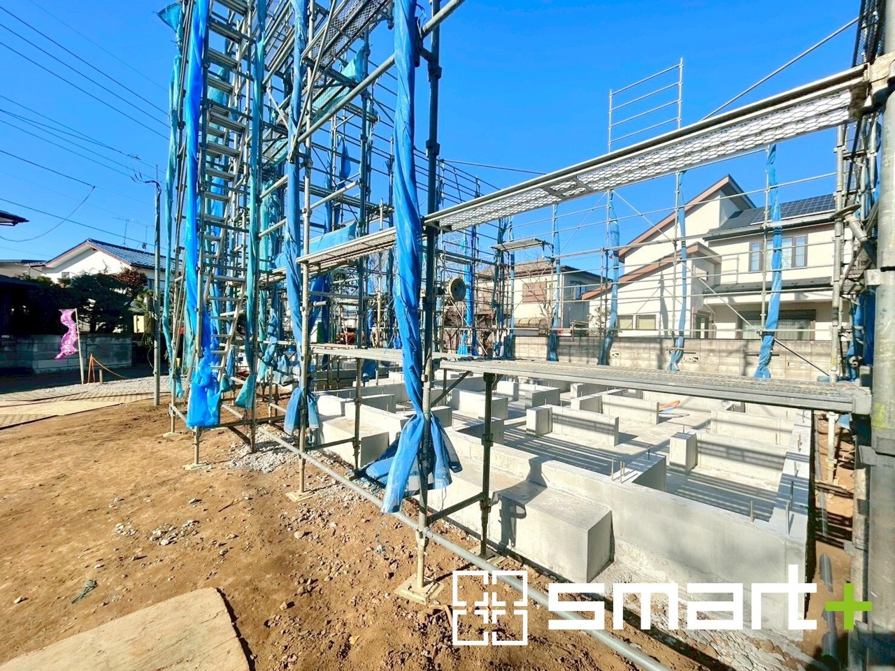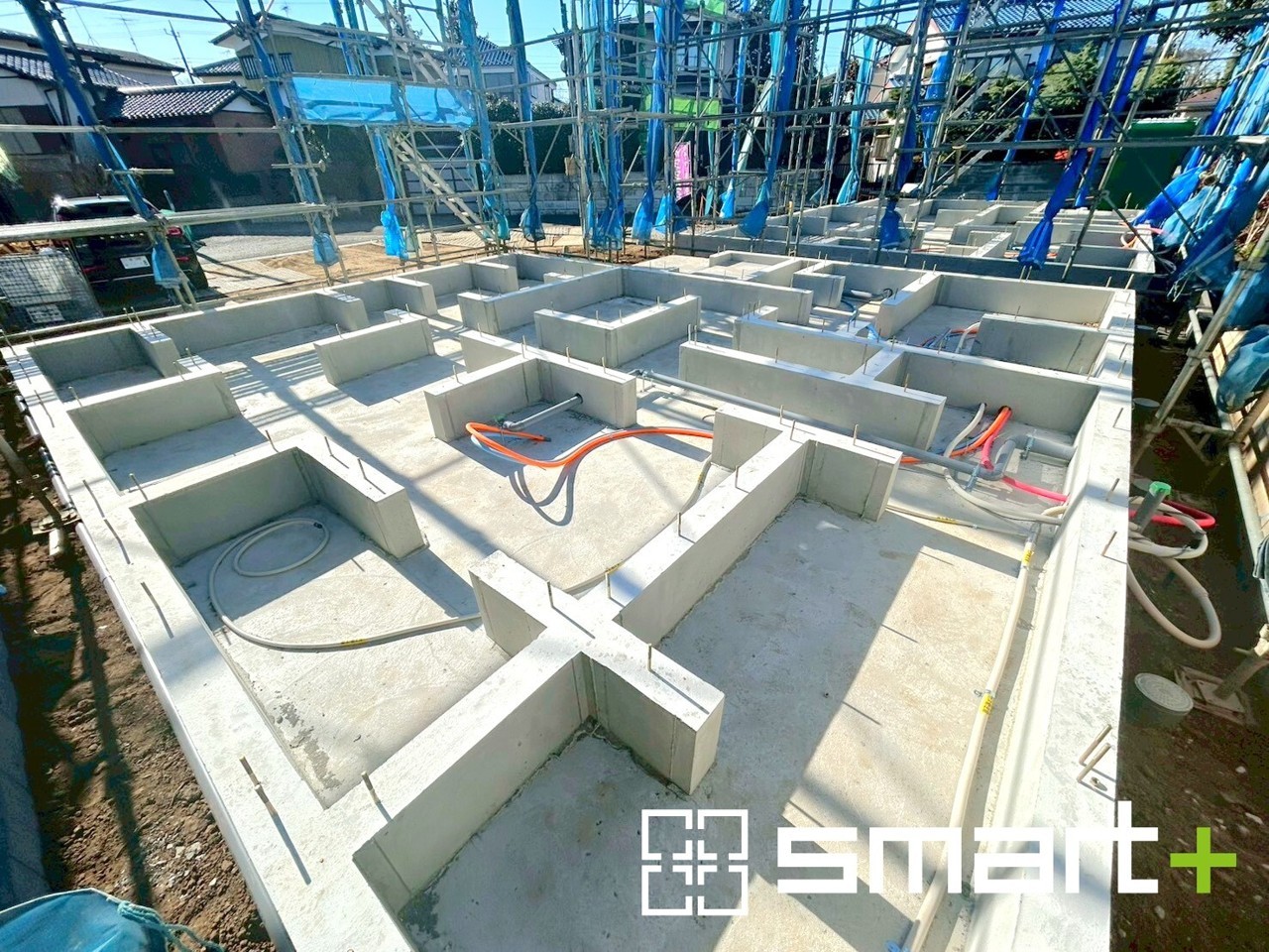 A号棟 ~ベタ基礎でしっかりとした土台~ ・コンクリートの中に鉄筋を配し強度を高めた「ベタ基礎」を採用。 ・しっかりとした土台を造ったうえで、その上に建物が築造されていきます。