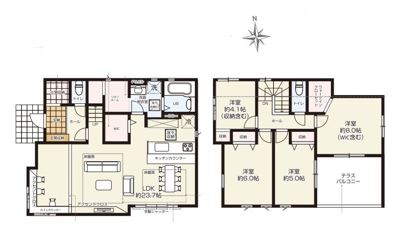 | 間取 | 4LDK + 2WIC、土間収納、リネンルーム (LDK23.7帖、洋室8帖、洋室6帖、洋室5帖、洋室4.1帖) | ||
