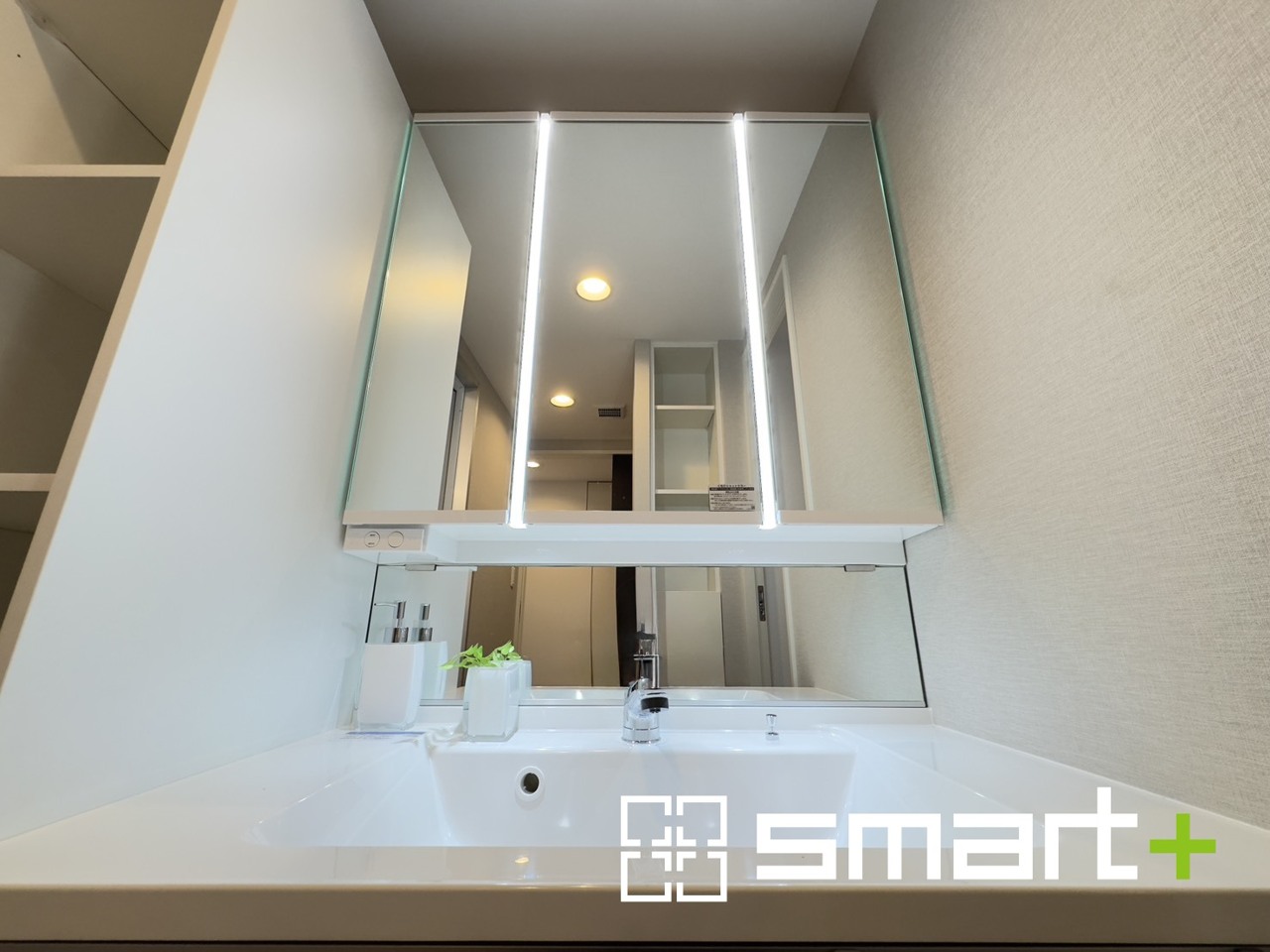 ~人気の三面鏡を採用~ ・洗面台は三面鏡仕様なので鏡の角度を変える事で頭の後ろの方までご確認可能です。 ・鏡の裏が収納になっておりますので、洗面台周りもスッキリと片付きます。