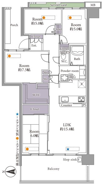 | 間取 | 4LDK + WTC (LDK15.4帖、洋室7.5帖、和室6帖、洋室5帖、洋室5帖) | ||