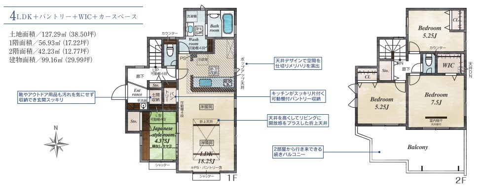 | 間取 | 4LDK + パントリー+WIC (LDK18.25帖、和室4.375帖、洋室7.5帖、洋室5.25帖、洋室5.25帖) | ||