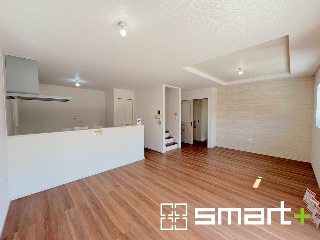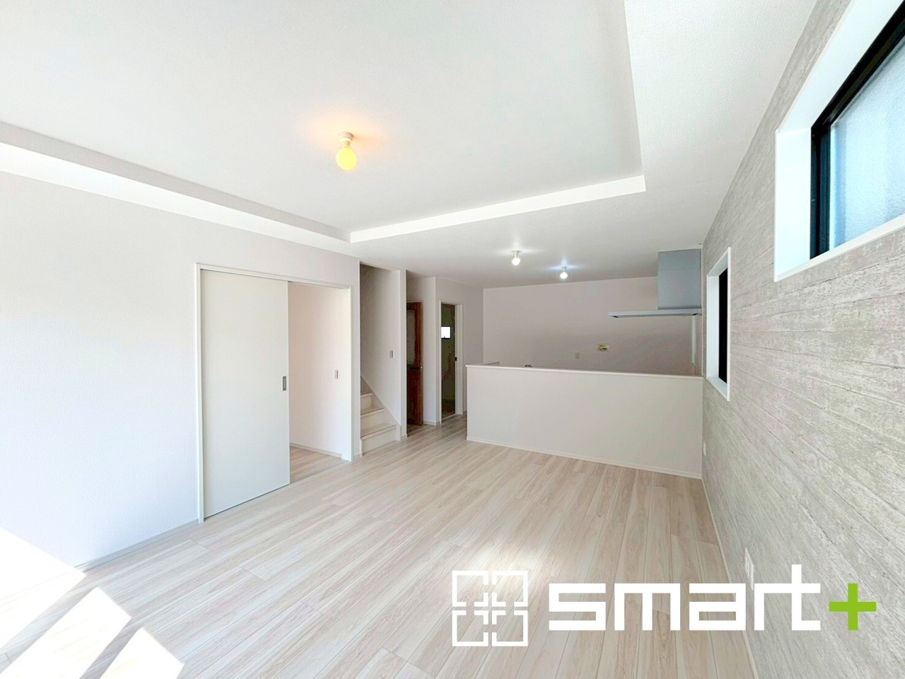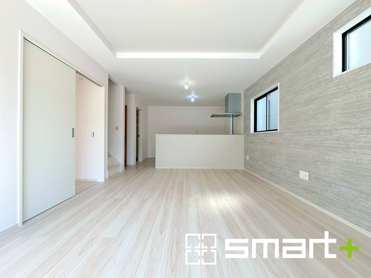 ~穏やかな陽の入るLDK~ ・大きな窓のあるLDKは陽当りも良好で明るい空間となっております。 ・アクセントクロスでシンプルなお部屋もメリハリのある空間になりますね。 (1号棟)