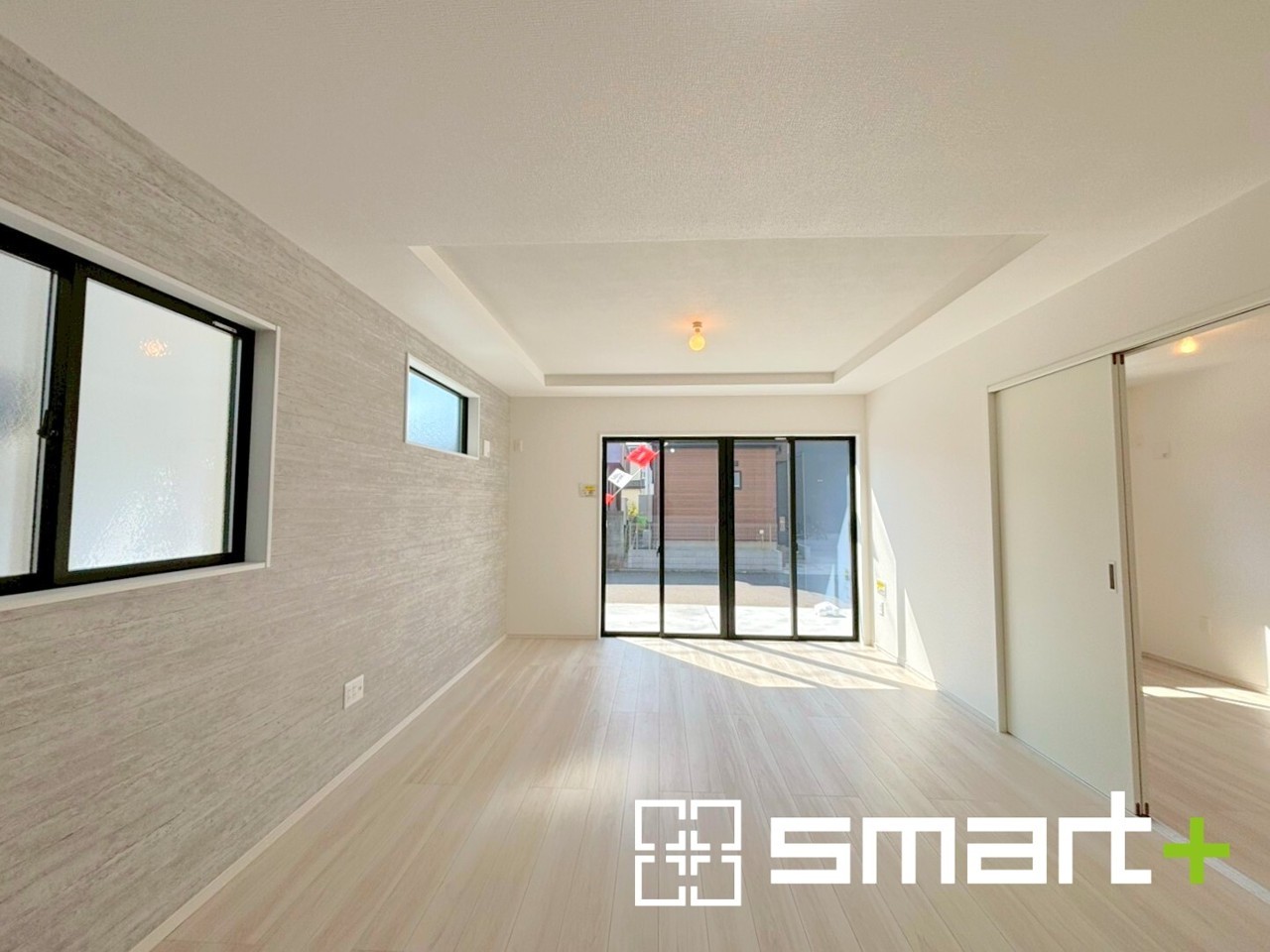 2号棟 ~穏やかな陽の入るLDK~ ・大きな窓のあるLDKは陽当りも良好で明るい空間となっております。 ・アクセントクロスでシンプルなお部屋もメリハリのある空間になりますね。