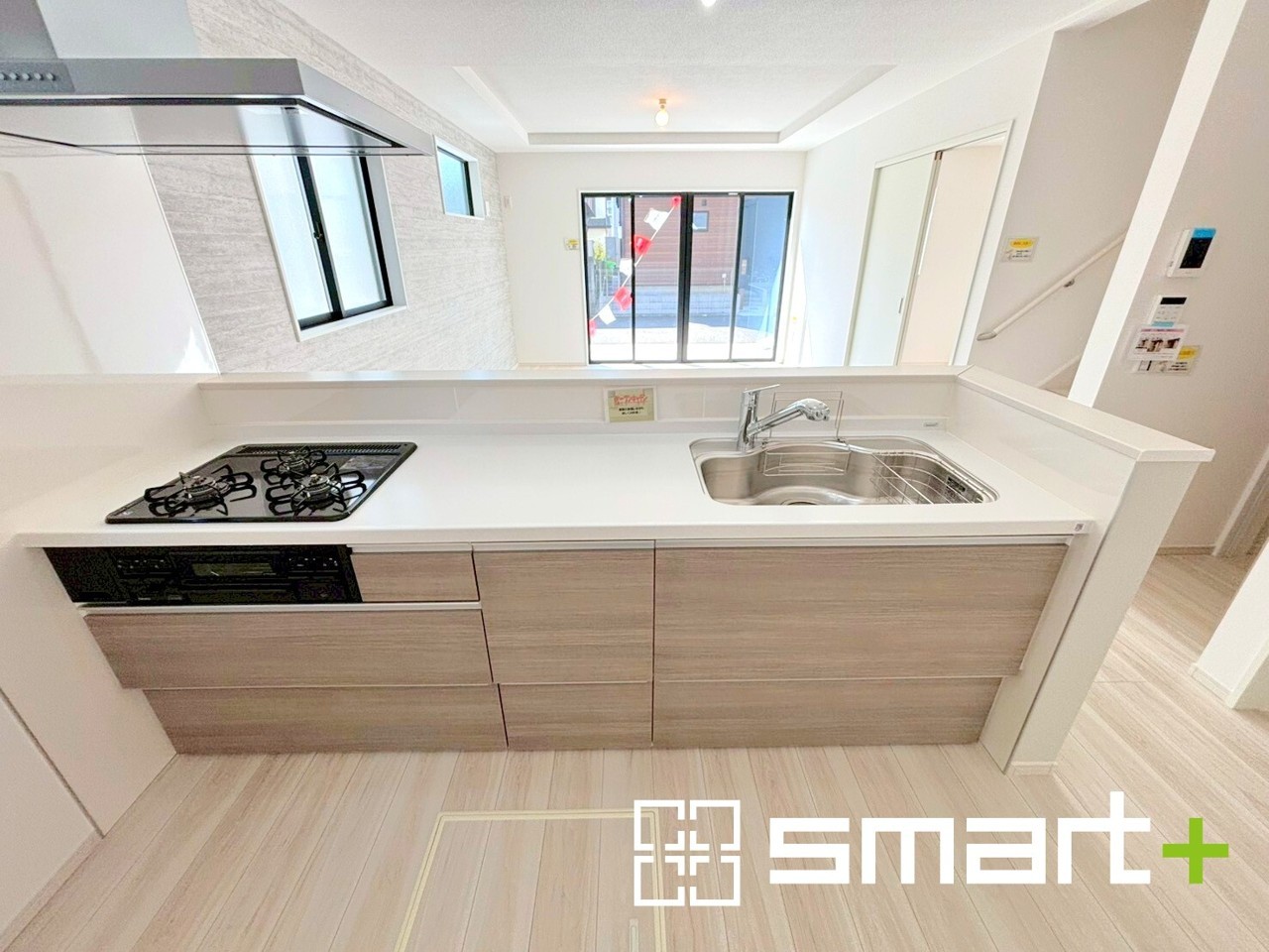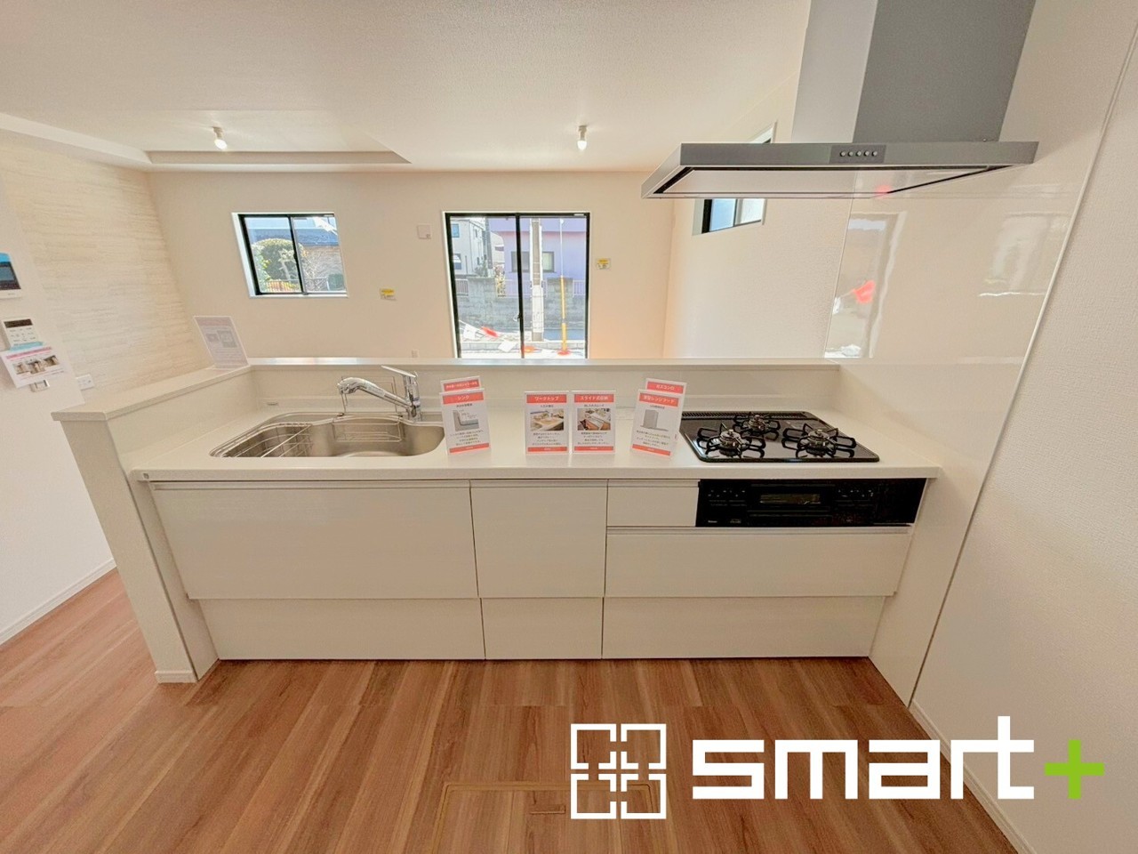 1号棟 ~人気のカウンターキッチン~ ・キッチンには余計な柱が無いので、リビングが見渡せ開放感のある造りとなっております。 ・蛇口には浄水器が内蔵されるなど機能面でも優れたキッチンです。