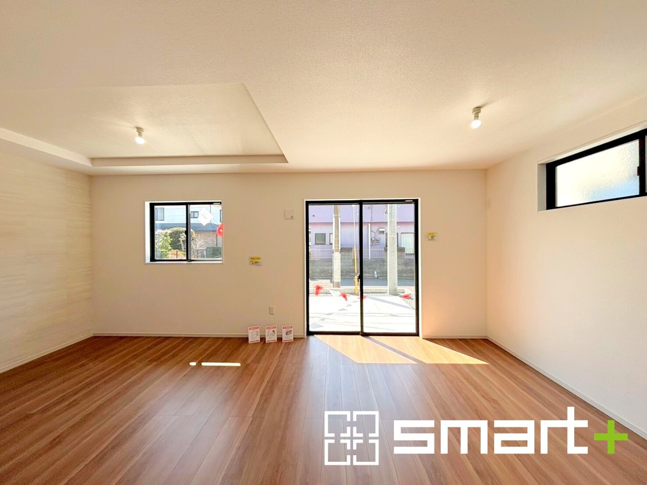 2号棟 ~日当り良好のLDK~ ・たくさんの窓からたっぷりの陽光が差し込む明るいリビングで寛ぎのひと時を。 ・柔らかみのあるナチュラルカラーで、家具やカーテンの色も選びやすいですね。