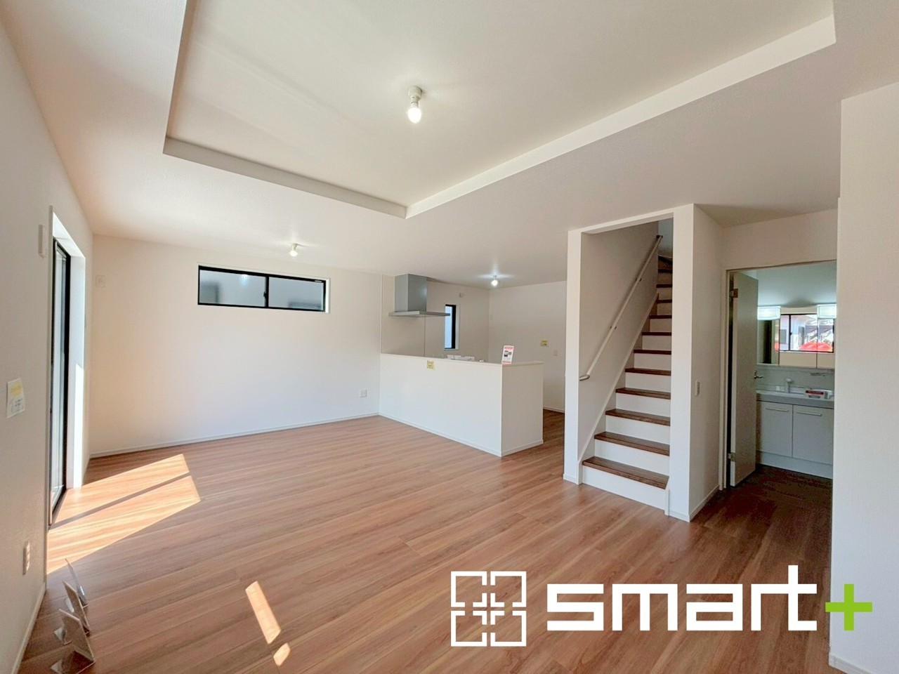 ~開放的なリビングイン階段~ ・ご家族のお出掛けや帰宅がわかるリビングイン階段。自然とコミュニケーションが増えますね。 ・家事をしながらリビング全体が見渡せるカウンターキッチンも魅力。 (1号棟)
