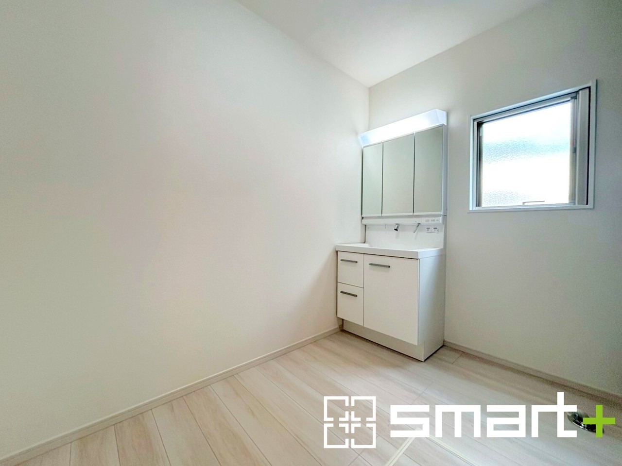 ~明るい洗面スペース~ ・窓から明るい陽が入り、気持ちよく朝の支度ができますね。 ・使い勝手の良い三面鏡タイプのシャワー付き洗面化粧台。鏡の裏に収納があるので洗面台周りもスッキリ。