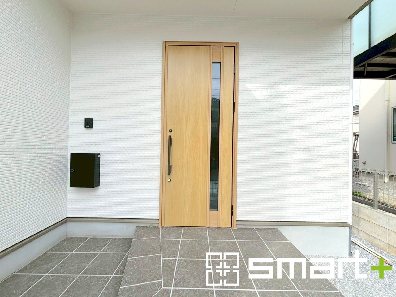 ~穏やかな陽が入る玄関~ ・窓に加えて玄関ドアのガラス部分からも穏やかな陽が入り、明るい玄関になります。 ・来客時に誰が来たかすぐにわかるモニター付きのインターフォンは防犯対策にもなります。