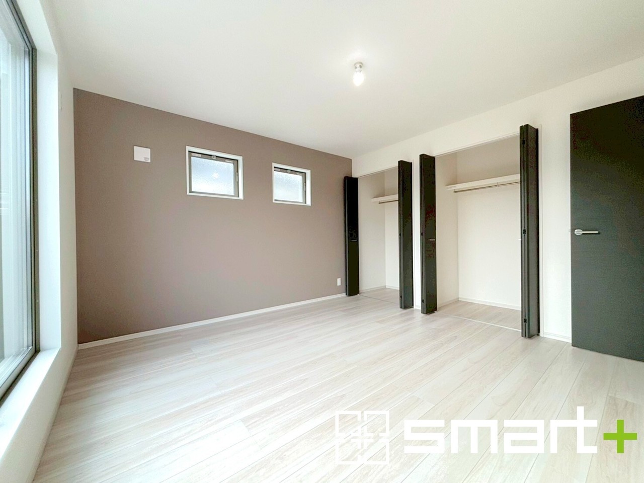 ~窓からはたっぷりの陽光~ ・ゆとりある広さの主寝室は8帖。ご夫婦やご兄弟でもゆったりお過ごしいただけます。 ・アクセントクロスでシンプルなお部屋もメリハリのある空間になりますね。