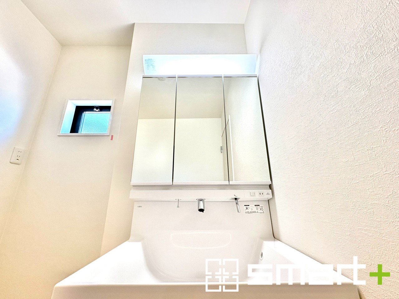 ~人気の三面鏡を採用~ ・洗面台は三面鏡仕様なので鏡の角度を変える事で頭の後ろの方までご確認可能です。 ・鏡の裏が収納になっておりますので、洗面台周りもスッキリと片付きます。