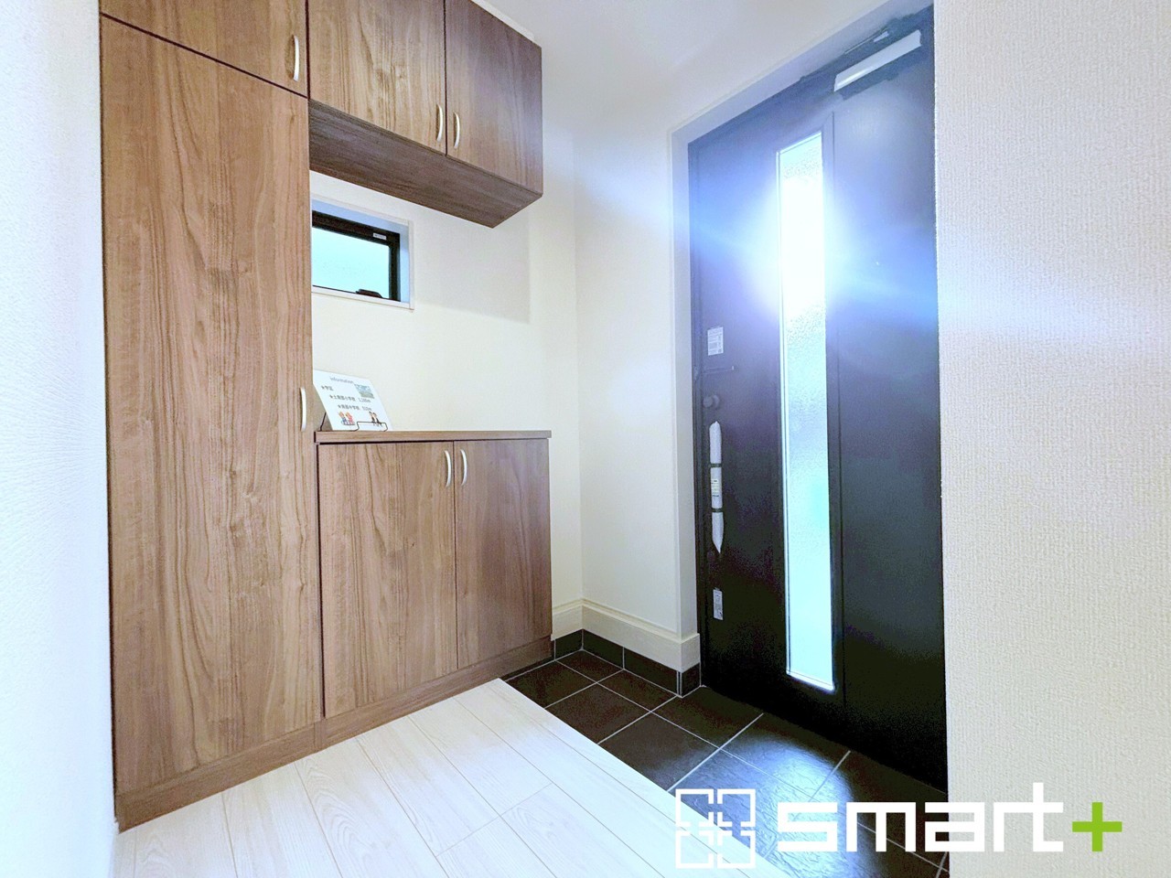 ~穏やかな陽が入る玄関~ ・窓に加えて玄関ドアのガラス部分からも穏やかな陽が入り、明るい玄関になります。 ・備え付けのシューズボックスはたっぷりしまえて玄関がスッキリ片付きますね。