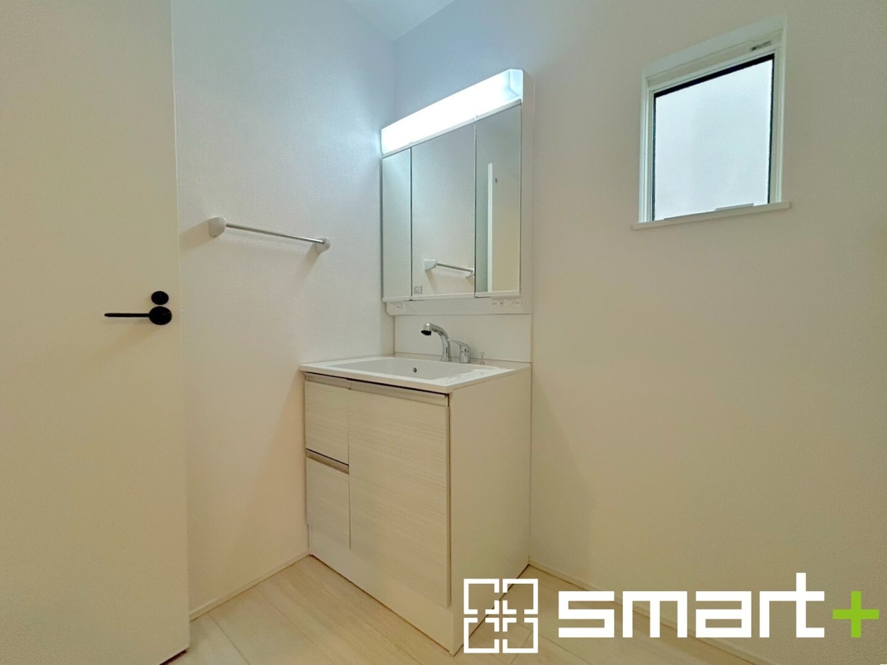 ~明るい洗面スペース~ ・窓から明るい陽が入り、気持ちよく朝の支度ができますね。 ・使い勝手の良い三面鏡タイプのシャワー付き洗面化粧台。鏡の裏に収納があるので洗面台周りもスッキリ。