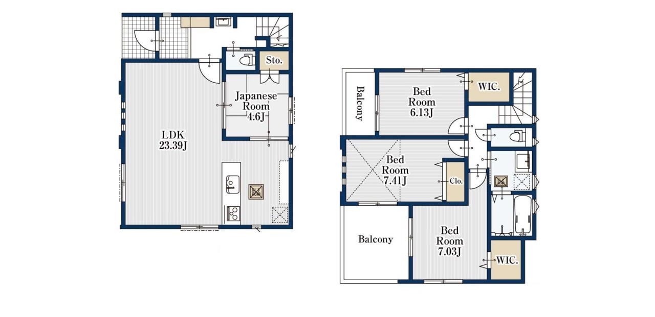 | 間取 | 4LDK + 2WIC (LDK23.39帖、洋室7.41帖、洋室7.03帖、洋室6.13帖、和室4.6帖) | ||
