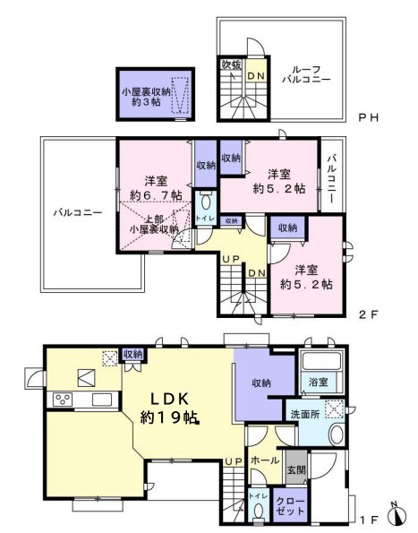 | 間取 | 3LDK (LDK19帖、洋室6.7帖、洋室5.2帖、洋室5.2帖) | ||