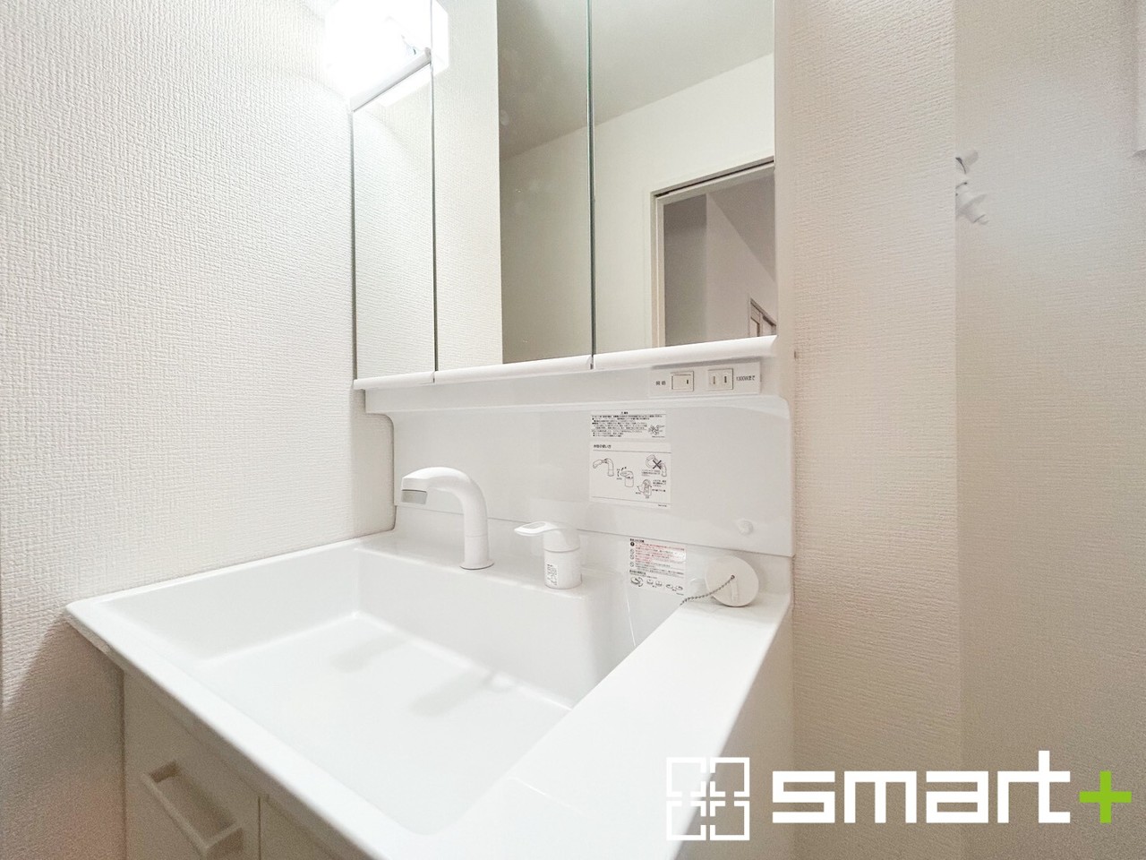 ~人気の三面鏡を採用~ ・洗面台は三面鏡仕様なので鏡の角度を変える事で頭の後ろの方までご確認可能です。 ・鏡の裏が収納になっておりますので、洗面台周りもスッキリと片付きます。