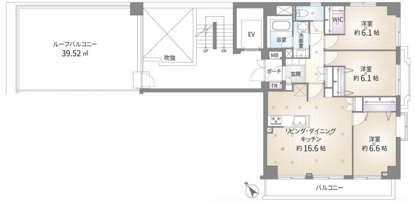 | 間取 | 3LDK + WIC、TR (LDK16.6帖、洋室6.6帖、洋室6.1帖、洋室6.1帖) | ||