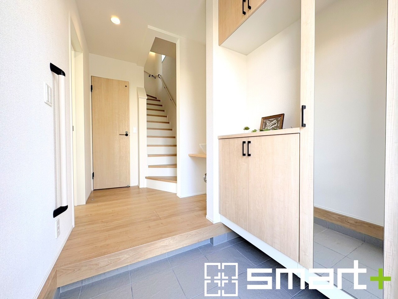 ~収納スペース充実の玄関周り~ ・圧迫感がなくスッキリ広々とした印象の玄関。 ・備え付けのシューズボックスはミラー付なので朝やお出かけ前の身支度チェックに大活躍です。