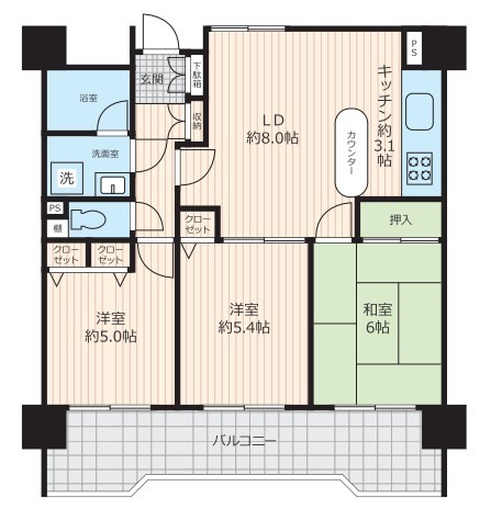 | 間取 | 3LDK (LD8帖、K3.1帖、洋室5.4帖、洋室5帖) | ||