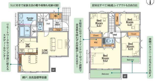 | 間取 | 4LDK (LDK20.5帖、洋室9.5帖、洋室5.2帖、洋室5.2帖、洋室5.2帖) | ||
